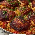 For an impressive presentation, serve the chicken and rice in rustic shallow bowls directly from the pan, showcasing all the colors and textures. Alternatively, plate individual portions topped with a fresh basil sprig and a lemon wedge for a quick zesty brightness. You can also try layering the rice on a platter and arranging the chicken thighs atop for a family-style spread.