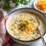 Serve the soup steaming hot, garnished generously with the reserved crispy bacon and fresh green onions. These garnishes not only add fantastic texture but also brighten the soup’s appearance beautifully.
