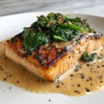 A delicious and elegant Pan-Seared Salmon recipe featuring a rich and creamy Florentine sauce made with garlic, spinach, heavy cream, and Parmesan cheese. This quick 25-minute meal combines crispy-skinned salmon fillets with a flavorful, velvety sauce perfect for a comforting yet sophisticated dinner.