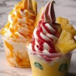 A refreshing and visually stunning Perfect Pineapple Strawberry Swirled Frappuccino that combines frozen pineapple and strawberries blended with milk and natural sweeteners, topped with whipped cream and freeze-dried fruit for a delightful, creamy summer beverage.