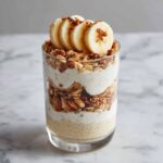 Take your serving cups or bowls and start by layering in the banana slices. Pour the creamy protein pudding mixture over the bananas, creating beautiful layers that make every bite a mix of fresh fruit and soft pudding.
