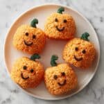 These Pumpkin-Shaped Rice Krispie Treats are a festive and fun no-bake dessert perfect for Halloween or fall gatherings. Made with classic marshmallow and Rice Krispies cereal, they’re tinted orange and shaped into pumpkins with green candy stems, making them both delicious and visually delightful for kids and adults alike.