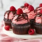 Keep leftover Raspberry Chocolate Cupcakes in an airtight container in the refrigerator. They stay fresh and moist for up to 4 to 5 days. To serve, remove them from the fridge about 30 minutes ahead so the buttercream softens to room temperature for the best texture and flavor.