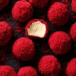While your cream cheese balls chill, break four of the fully cooled cupcakes into small crumbs—these crumbs will be your coating. After the balls are firm, gently roll each one in the red velvet crumbs until fully covered. This crumb coat not only adds gorgeous color but also melts on the tongue alongside the cheesecake filling. Place the coated bites back on the parchment-lined tray and refrigerate until ready to serve.