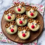 - Decorate: To create the reindeer faces, gently press two mini pretzels into the top of each cupcake to form antlers. Add two candy eyes or alternatively, place white chocolate chips with mini chocolate chips for the pupils as eyes. Position a red chocolate candy on the front center of the cupcake as the nose to represent Rudolph, or choose brown for a classic look. Use a small dab of frosting or melted chocolate to secure the decorations in place. Allow the decorations to set before serving to keep them intact.