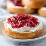 While the sauce cools, get the cheese blend ready. Combine the honey goat cheese and cream cheese in a food processor or mixing bowl. Whip or blend them together until the mixture is incredibly smooth and creamy. This silky texture makes it easy to spread and perfectly complements the tangy rhubarb on top. The mild sweetness from the honey infused in the goat cheese balances the tart fruit sauce elegantly.