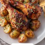 This Roasted Chicken and Potatoes recipe features tender, flavorful roasted chicken seasoned with a homemade garlic and herb dry rub, accompanied by crispy, golden potatoes tossed in a savory garlic butter sauce. The dish is cooked entirely in the oven, making it a comforting and satisfying meal perfect for family dinners or special occasions.