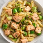 A quick and flavorful Salmon Pasta with Brussels Sprouts recipe, combining tender pan-seared salmon, sautéed Brussels sprouts, and al dente pasta tossed in a zesty lemon and Parmesan sauce. Perfect for a nutritious and satisfying weeknight dinner ready in just 30 minutes.