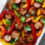 This Sausage and Peppers recipe features Italian chicken or turkey sausage roasted alongside colorful bell peppers and onions, seasoned with herbs and spices for a flavorful and easy meal. Perfectly roasted in the oven, this dish is a hearty and vibrant dinner option that can be served on its own or topped with fresh herbs and Parmesan cheese.