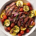 This Sizzling Steak with Roasted Veggies recipe is a quick and flavorful dish perfect for a healthy weeknight dinner. Thinly sliced sirloin steak is seasoned and cooked to perfection alongside a colorful medley of roasted zucchini, yellow squash, tomatoes, and red onion. The combination of simple spices and olive oil enhances the natural flavors, delivering a satisfying meal rich in nutrients and vibrant textures.