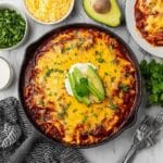 These Skillet Enchiladas combine tender shredded rotisserie chicken with a flavorful mild red enchilada sauce, seasoned with a blend of spices and green chilies. Corn tortillas are folded into the saucy mixture, topped with melted cheddar-jack cheese, and baked until bubbly and golden. Garnished with fresh cilantro and creamy avocado slices, this quick and comforting dish is perfect for a satisfying weeknight meal.