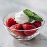 - Top with whipped cream: Spoon or pipe the mint-infused whipped cream over the strawberries for a beautiful presentation.