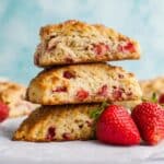 These scones are perfect alongside a cup of hot tea or a smooth latte for a relaxed afternoon treat. You can also serve them with clotted cream or a smear of homemade strawberry jam to double down on those fruity flavors and enhance the indulgence.