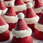 Unfortunately, freezing isn’t ideal for this recipe. The whipped cream will not hold up well after thawing, and the strawberries’ texture can become mushy, which means your Strawberry Santas may lose the charm that makes them special.