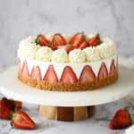 You can freeze the cheesecake if needed—wrap it tightly in plastic wrap and foil to prevent freezer burn. When ready to enjoy, thaw overnight in the refrigerator. Keep in mind the texture of fresh strawberries might soften slightly after freezing, so it’s best to freeze before adding fresh garnishes.