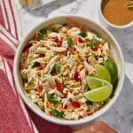Pour the luscious peanut dressing over the salad mixture and toss gently but thoroughly to coat every shred and crunch. Serve immediately with lime wedges on the side for an extra splash of brightness you can add just before eating.