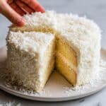 - Assemble Cake: Once the cake is completely cooled, spread the frosting evenly over the outside of the cake. Press the sweetened shredded coconut all around the frosted cake, coating it completely. For easier cleanup, assemble the cake over a large baking sheet to catch excess coconut.