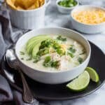 Topping this White Chicken Chili Recipe with fresh chopped cilantro adds a pop of vibrant color and refreshing herbal notes. Feel free to add shredded cheese, creamy avocado slices, or crunchy tortilla strips to elevate the texture and layers of flavor even more.